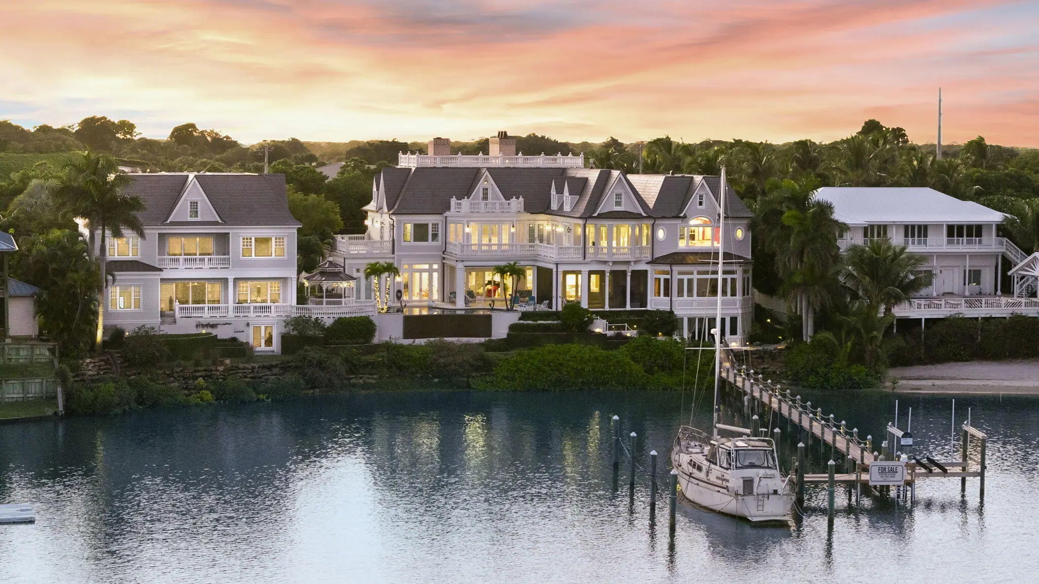 Introducing Anglesea Estate, a waterfront residence where timeless European architecture meets modern coastal luxury along Jupiter's Intracoastal Waterway. Recently repositioned and now offered under appraised value, this extraordinary property presents a rare opportunity to acquire a legacy waterfront estate among Jupiter's most significant properties. Completed in 2016, the residence commands 200 feet of elevated Intracoastal frontage, offering sweeping water views and a rare combination of waterfront presence and flexibility seldom found in Jupiter. Designed as a multi-structure waterfront compound, Anglesea Estate blends classic craftsmanship with contemporary sophistication for a distinguished South Florida lifestyle. Inside, exceptional craftsmanship is evident throughout, from custom millwork and beautiful stained glass accents to an exquisite hand-carved Carrara marble fireplace, Murano chandeliers, and refined architectural details. The chef's kitchen is designed for both entertaining and everyday living, featuring premium appliances and dual walk-in pantries. The primary suite serves as a private retreat, complete with its own fireplace, dual spa-inspired en-suites, and expansive walk-in closets. Additional bedroom suites open to broad terraces overlooking the Intracoastal, while a three-story elevator provides effortless access throughout the home. Outdoor living is equally impressive. The covered veranda features retractable hurricane and insect screens and opens to a heated pool and spa powered by both solar and electric systems. A 1,000-gallon buried propane tank, whole-home generator, and advanced lightning and surge protection provide added peace of mind. For boating enthusiasts, the 140-foot private dock with a 16,000-pound lift sits along a quiet no-wake stretch of the Intracoastal with direct access to the Jupiter Inlet and Atlantic Ocean. Anglesea Estate offers exceptional flexibility. In addition to the main residence, the property includes a separate two-story guest house with an open concept three bedrooms and two baths, along with family/game room, a full kitchen, laundry, and a two-car garage. Above the guest house, a private professional office suite with kitchenette and one-and-a-half baths creates an ideal live-work environment. The 1,250-square-foot Captain's Quarters provides additional flexibility with plans available to convert the space into another waterfront living suite. The property also benefits from both residential and commercial zoning designations, offering rare optionality for a private executive compound, family office, or luxury live-work estate. Located moments from Jupiter Hills Golf Club and many of South Florida's premier PGA-caliber golf courses, Anglesea Estate offers the flexibility and waterfront presence typically found only in Palm Beach compound estates. With 200 feet of Intracoastal frontage, and now offered under appraised value, Anglesea Estate represents a rare opportunity to secure one of Jupiter's most exceptional waterfront properties.